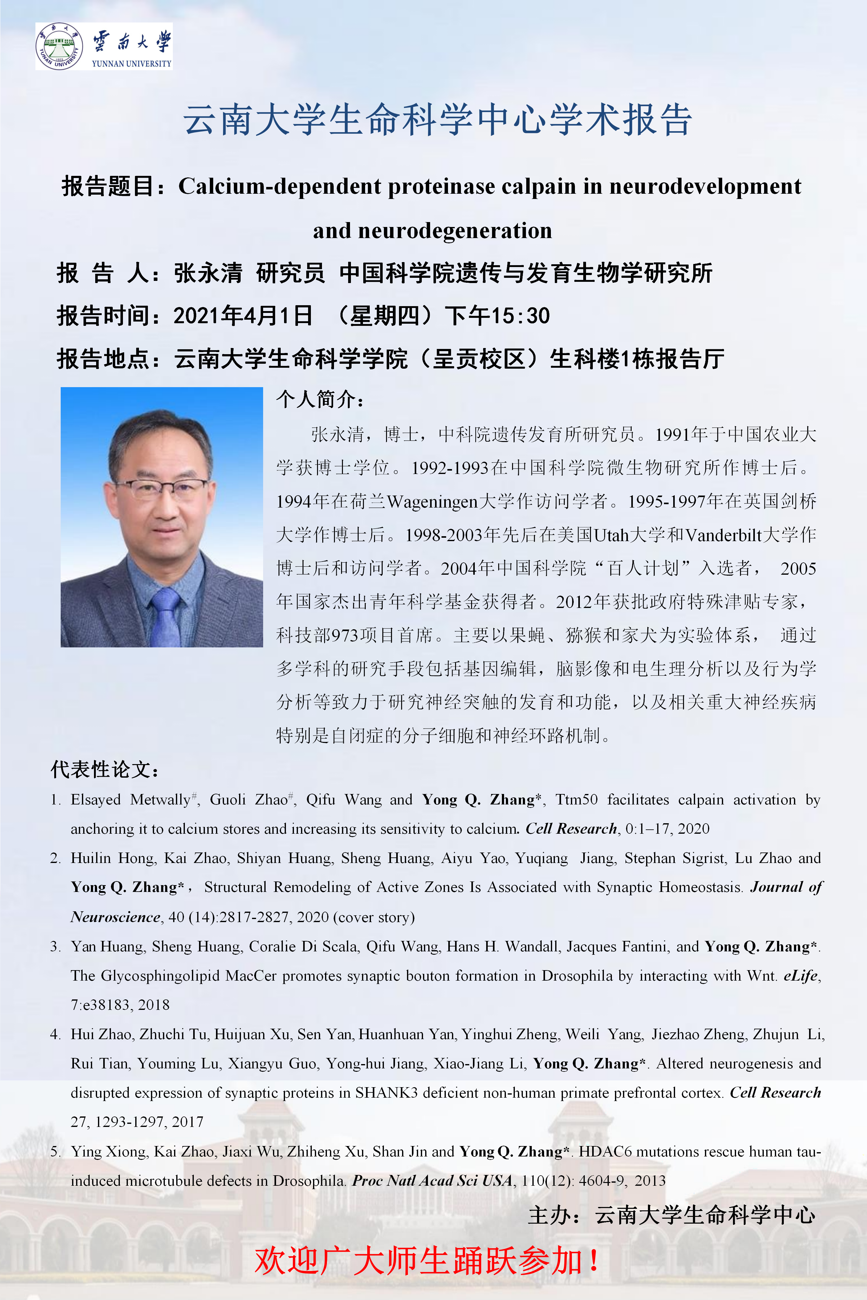 当前位置: 首页>>讲座信息>>学术讲座>>正文 Calcium-dependent proteinase calpain in neurodevelopment and neurodegeneration-张永清研究员 发布时间: 2021年03月30日 09:10 阅读次数: